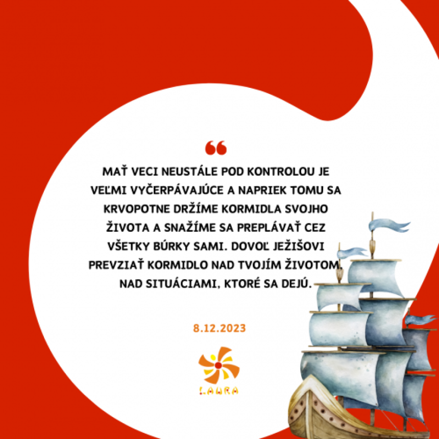 Mať veci neustále pod kontrolou je veľmi vyčerpávajúce a napriek tomu sa krvopotne držíme kormidla svojho života a snažíme sa preplávať cez všetky búrky sami. Dovoľ Ježišovi prevziať kormidlo nad tvojím životom, nad situáciami, ktoré sa dejú. To znamená, že mu veci nebudeš len odovzdávať, ale necháš na neho, ako dopadnú. Nebudeš Ježišovi kafrať do práce. On vie, čo robí.