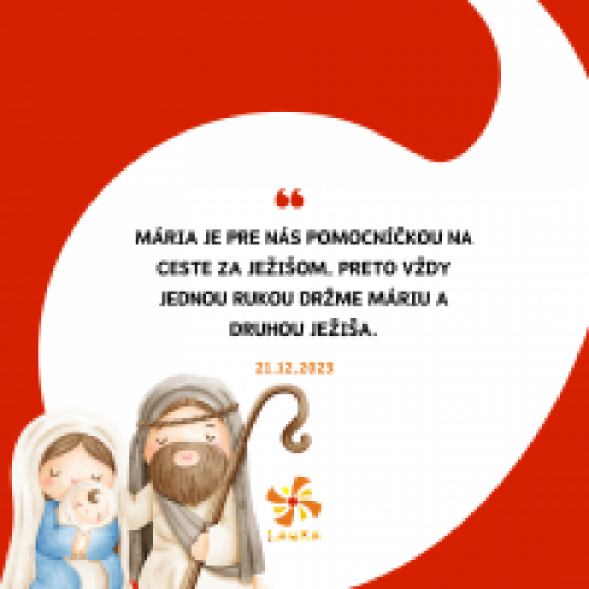 Mária už ako tehotná sa vydala na cestu za Alžbetou, svojou príbuznou, aby jej pomohla. Nebála sa práce, nebola lenivá. Alžbeta dostala od Ducha Svätého poznanie, že Mária nie je obyčajná žena. Tým nám ukázala, že aj my si ju máme vážiť - tak ako ona. Mária uverila tomu, čo jej prisľúbil Pán, že porodí svetu Spasiteľa. A aj keď určite mala strach, nepovedala Bohu nie, ale v pokore postavila Božiu vôľu pred tú svoju. Mária je pre nás Pomocníčkou na ceste za Ježišom, preto vždy jednou rukou držme Máriu a druhou Ježiša.