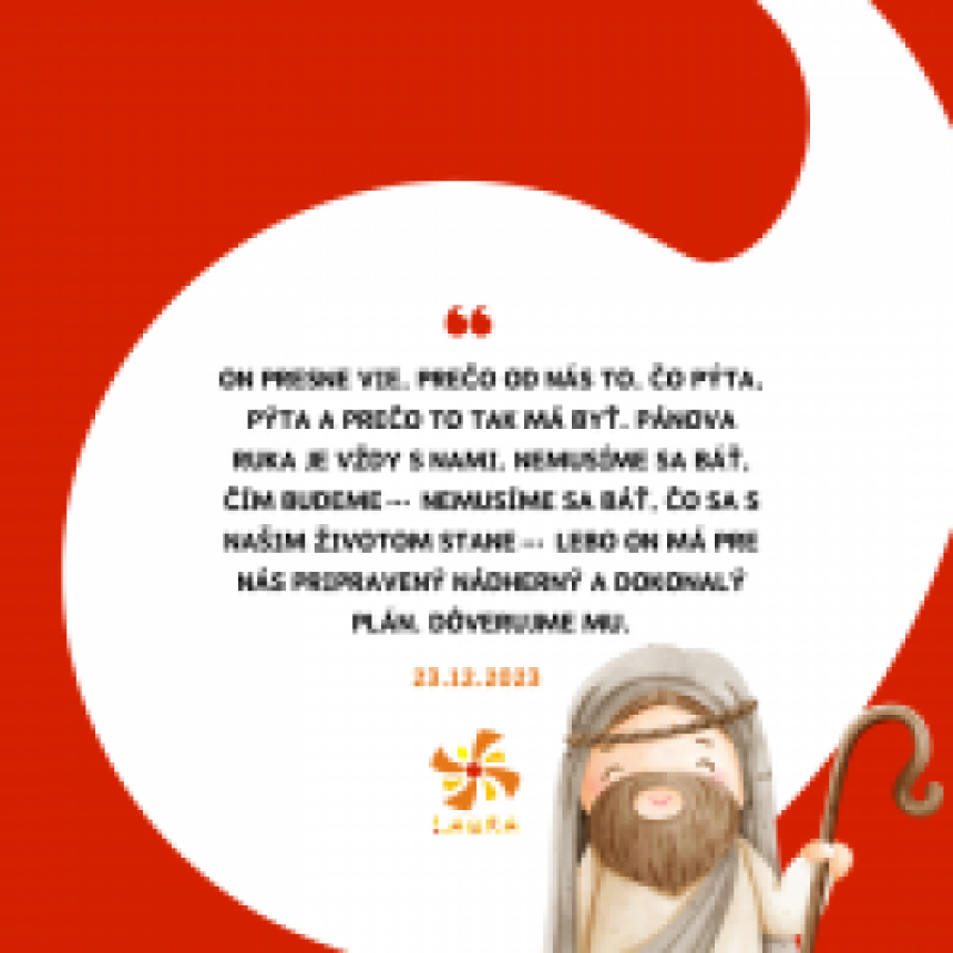 Alžbeta so Zachariášom nám ukazujú nie len to, ako je pre Pána všetko možné, ale aj to, ako má Pán pre nás plán, ktorý nám, ako ľuďom, môže niekedy pripadať zvláštny/nevídaný, no stále je úplne dokonalý. Ján sa narodil Alžbete v pokročilom veku. Nedali mu meno po otcovi - ako bolo tradíciou, ale dali mu meno, ktoré mu pripravil Pán. Častokrát sa aj nám môže stať, že od nás žiada niečo, čo nie je bežné alebo čo nebude pre nás ľahké… No on presne vie, prečo od nás to, čo pýta, pýta a prečo to tak má byť. Pánova ruka je vždy s nami. Nemusíme sa báť, čím budeme… Nemusíme sa báť, čo sa s našim životom stane… Lebo on má pre nás pripravený nádherný a dokonalý plán. Dôverujme mu.