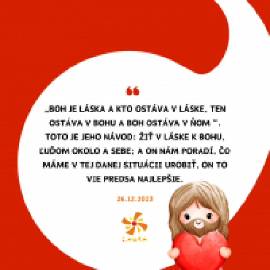 Vianoce – sviatky lásky, pokoja a po večeri už aj pohody. Oproti tomu počujeme dnes niečo iné - o umučení Štefana a o utrpení. Vyzerá to, akoby nás Boh najskôr namotal láskou a potom nám povedal: ,,Život so mnou je úplné utrpenie“. Našťastie, náš Boh je naozaj LÁSKA. Láska, ktorá dáva seba a bez rozdielu. Dokonca táto Láska myslí na každý detail v našom živote. Evanjeliom, ktoré na prvé počutie hovorí o utrpení, nám Boh neukazuje nič iné ako to, čo už sa deje. Ľudia žijúci v tme ohovárajú, aj keď pred chvíľou boli tvoji priatelia. Ak začneš hovoriť o Ježišovi alebo niekoho upozorníš v láske na nejaké zlo, vyjdeš z toho ako ten najhorší. Boh na nás myslel a to, čo nám dnes ponúka, je návod. ,,Ale kto vytrvá do konca, bude spasený.“ Na inom mieste zas čítame: „Boh je láska a kto ostáva v láske, ten ostáva v Bohu a Boh ostáva v ňom“. Toto je jeho návod: žiť v láske k Bohu, ľuďom okolo a sebe; a on nám poradí, čo máme v tej danej situácii urobiť, on to vie predsa najlepšie.