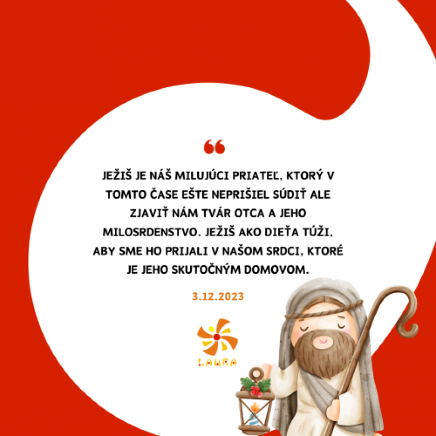 “Aby vás nenašiel spať, keď príde nečakane!” Ohľadom tejto výzvy ostávam pokojná, ako mamu malých detí ma Pán pravdepodobne naozaj spať nenájde. Samozrejme nejde o to, aby sme ponocovali, Pán Ježiš rád hovoril obrazne a v metaforách. Cez toto Slovo hovorí k nám aj dnes, na začiatku adventného obdobia, vyzýva nás k bdelosti. Najprv k nám Ježiš neprichádza ako pán domu, ale ako dieťa, ktoré hľadá domov, ako dieťa, ktoré je závislé od nášho prijatia. Ježiš je náš milujúci priateľ, ktorý v tomto čase ešte neprišiel súdiť ale zjaviť nám tvár Otca a Jeho Milosrdenstvo. Ježiš ako dieťa túži, aby sme ho prijali v našom srdci, ktoré je jeho skutočným domovom. Pripravujme sa na Jeho príchod v malom dieťati, ako aj na Jeho slávny druhý príchod každodennou modlitbou, v ktorej budeme prosiť o lásku, teda o Jeho prítomnosť v nás. Prebuďme svoje srdce, túžme po živom Bohu!