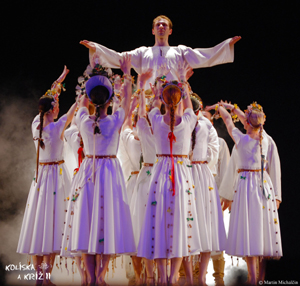 Nové predstavenie „Kolyska i chrest“, čiže Kolíska a kríž poddukeľského umeleckého ľudového súboru je dôkazom týchto vývojových tendencií, zároveň však prekvapuje radikálnosťou, s akou integruje moderný výrazový tanec. Klasický balet minimalizuje dotyk so zemou pohybom na špičkách, a tak fúzia s ním, jeho vzdušnosťou ani nebola možná, nakoľko folklór si pri všetkom odľahčení musí zachovať istú zemitosť, korene.